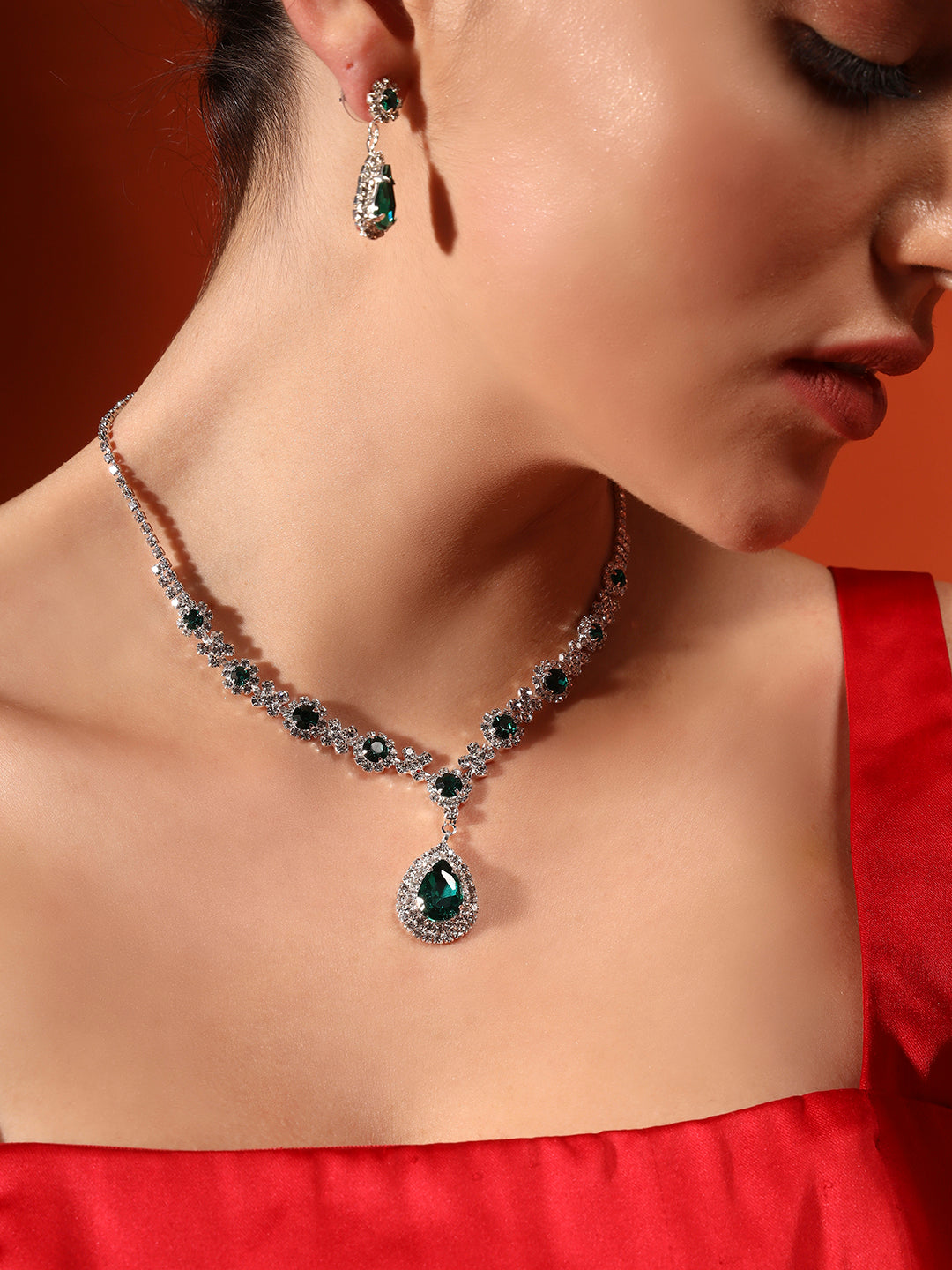 The Emerald Grace Set captures the charm of regal evenings and the softness of modern design. Crafted with precision-cut green stones set in a silver-plated base, this set blends sophistication with a touch of vintage allure.