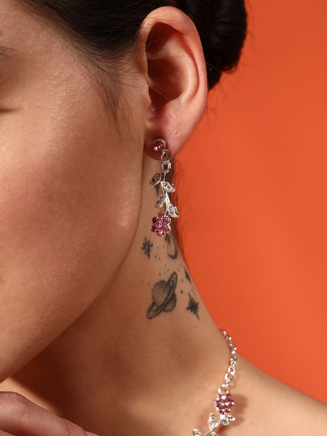Handcrafted with precision, this silver-plated necklace and earring set features delicate pink crystals arranged in a blooming floral motif. The soft blush tones shimmer beautifully against the skin, adding a graceful touch of romance to every look.