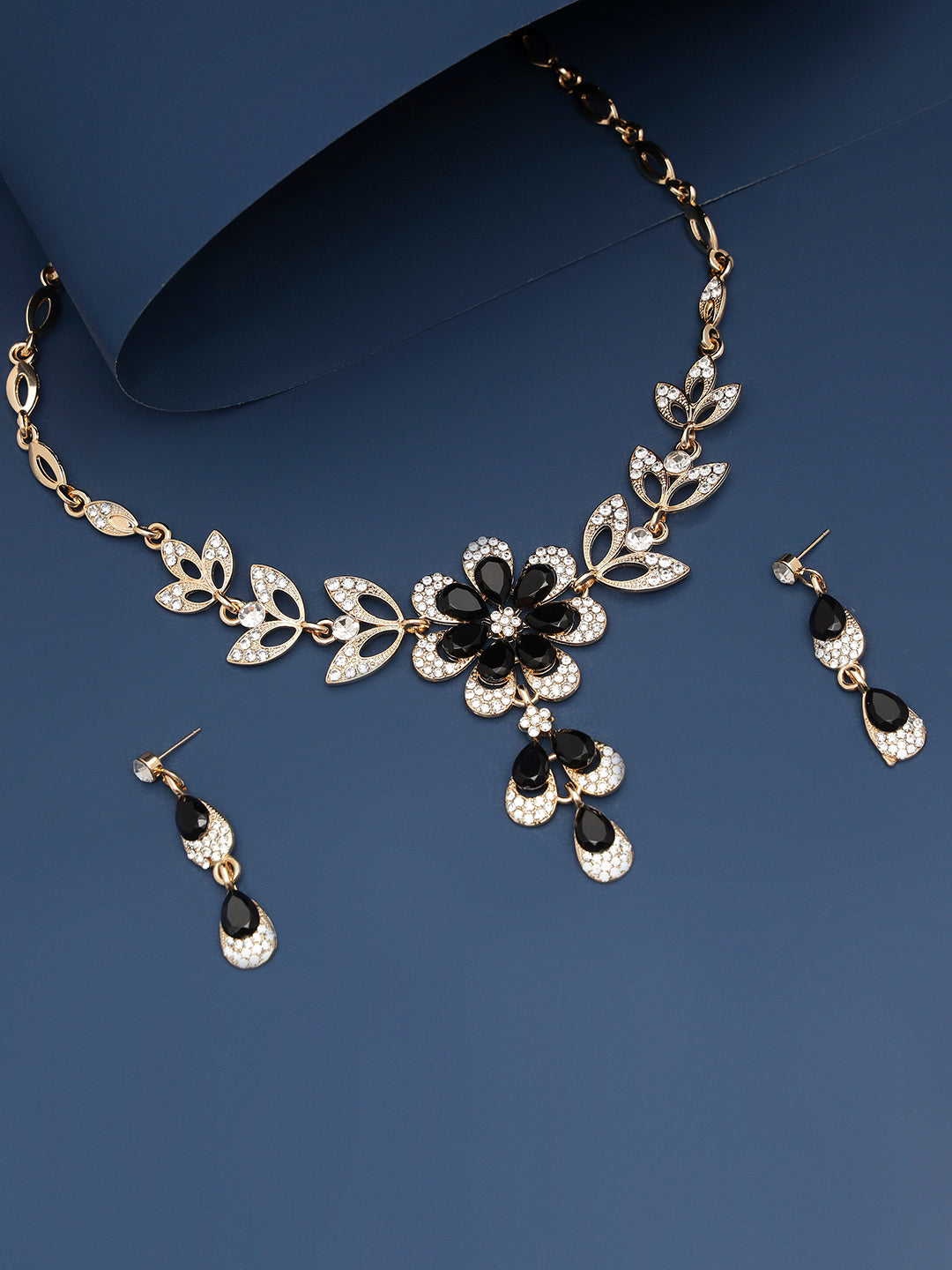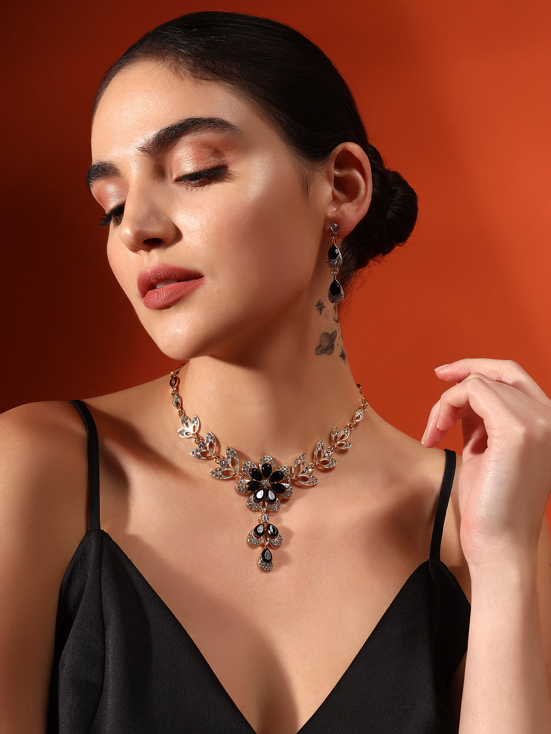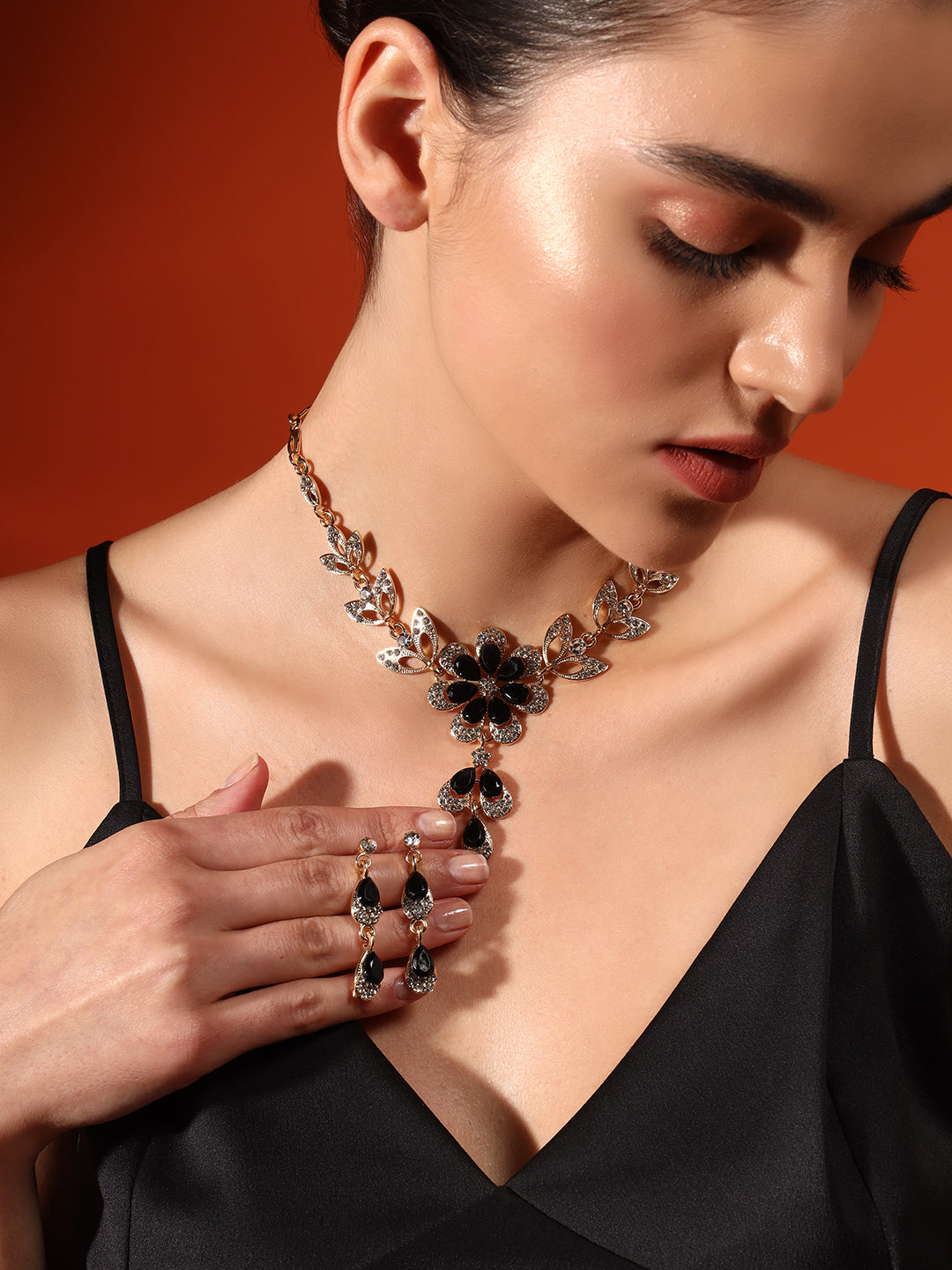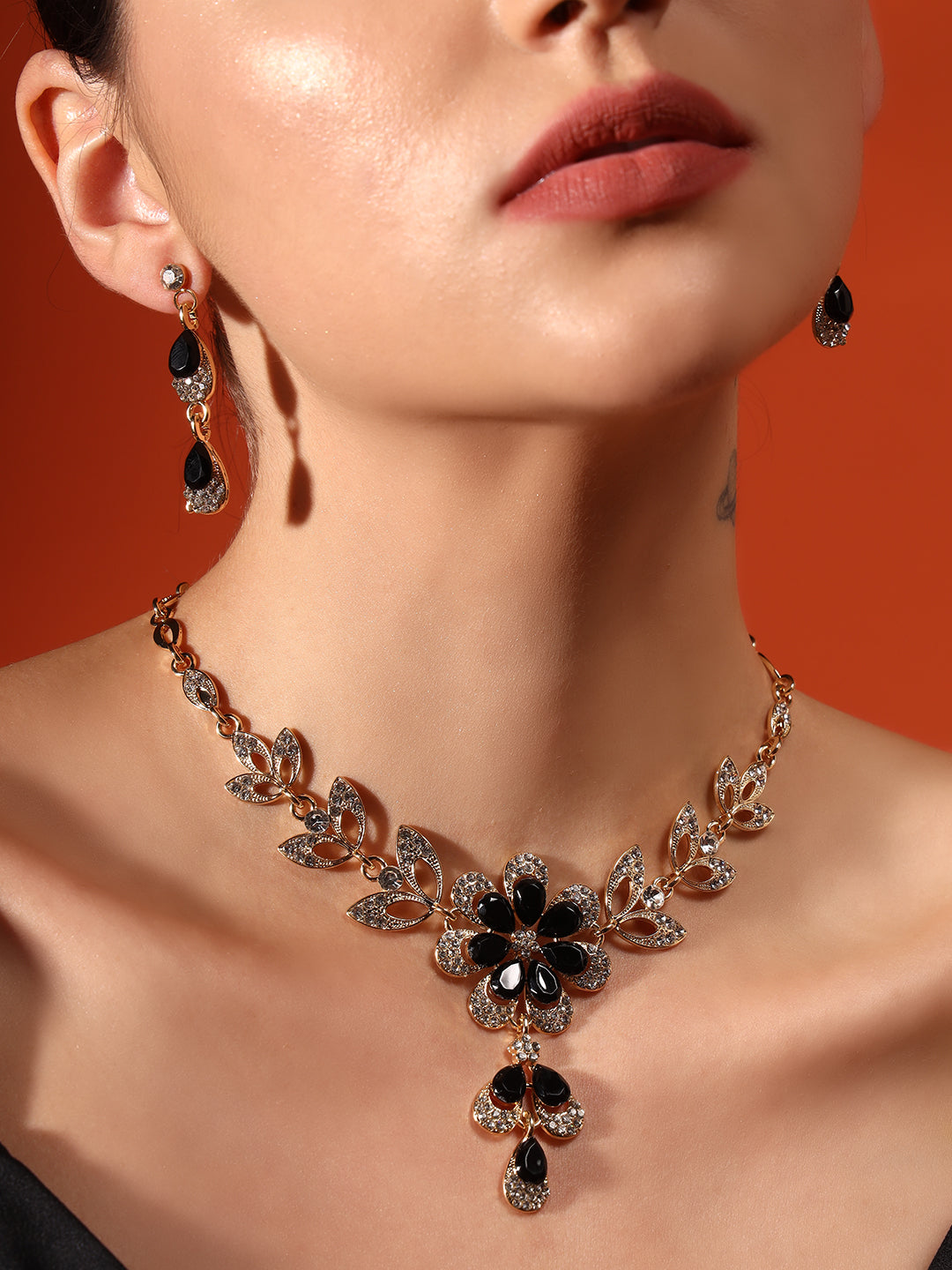 The statement floral design adds a touch of artistry, while the drop earrings mirror the necklace’s graceful symmetry. Ideal for cocktail nights, weddings, and evening gatherings, it’s the kind of piece that turns every look into a quiet statement.